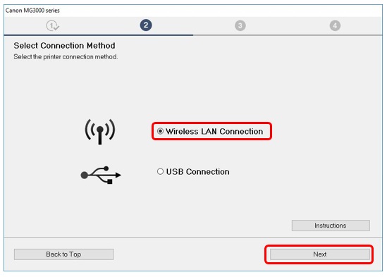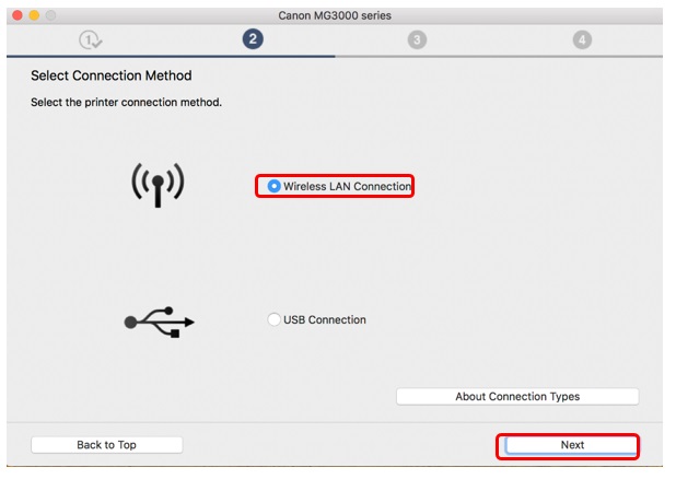 10. Ha a nyomtatót korábban még nem csatlakoztatta a vezeték nélküli hálózathoz, akkor a következő képernyő jelenik meg. Válassza a Wireless LAN Connection (Vezeték nélküli LAN-kapcsolat) lehetőséget, majd kattintson a [Next/Tovább] gombra.
