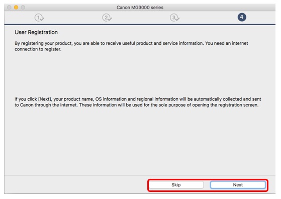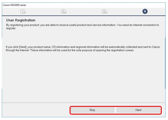 27. A nyomtató regisztrálásához kattintson a [Next/Tovább] gombra (ekkor egy ablak nyílik meg a böngészőjében). Másik megoldásként kattintson a [Skip/Kihagyás] gombra.