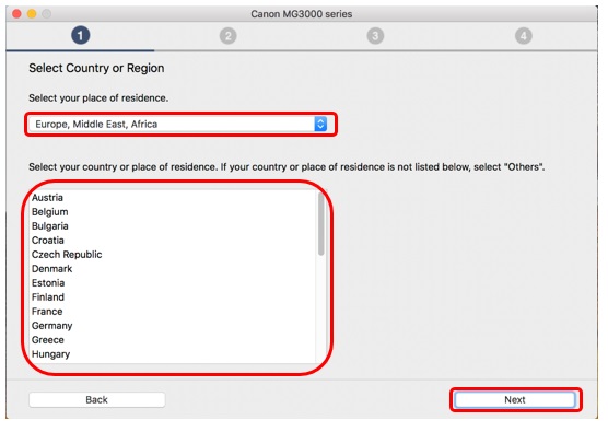 3. Válassza ki a régiót és az országot, majd kattintson a [Next/Tovább] gombra.