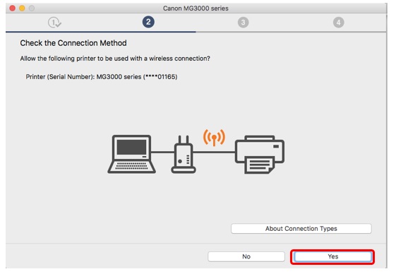 9. Ha a nyomtató korábban már csatlakoztatva lett a vezeték nélküli hálózathoz, akkor a következő képernyő jelenik meg. A telepítés folytatásához kattintson a [Yes/Igen] lehetőségre, majd ugorjon a 17. lépésre. Ha a nyomtató még nincs csatlakoztatva, ugorjon a 10. lépésre.