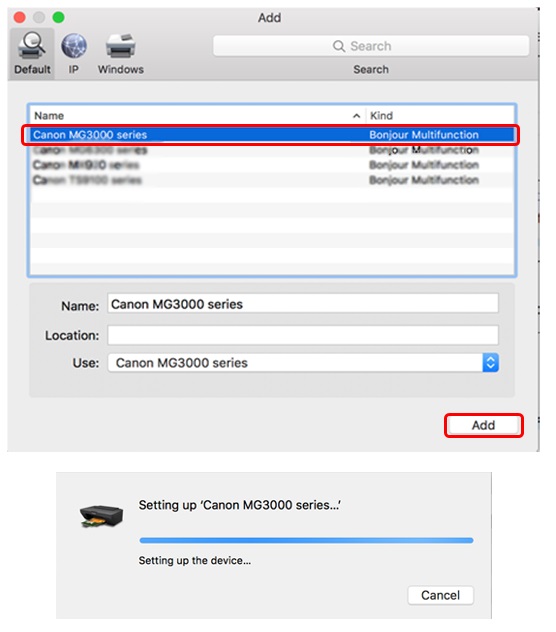20. Válassza a Canon „MG3000 series” „Bonjour Multifunction” lehetőséget a listáról, majd kattintson az [Add/Hozzáadás] gombra.