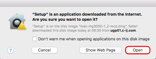 A beállítás elindításához kattintson duplán a [Setup/Beállítás] ikonra. Ha megjelenik a következő képernyő, kattintson az [Open/Megnyitás] lehetőségre.