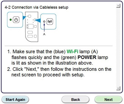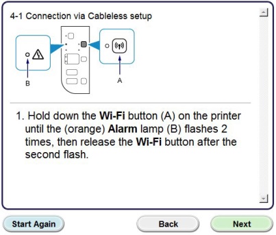 3. Ha megjelenik a [Connection via Cableless setup/Csatlakozás kábel nélküli beállítás segítségével] képernyő, tartsa lenyomva a nyomtató [Wi-Fi] gombját (A), amíg a narancssárga jelzőfény (B) 2-szer fel nem villan, majd a második villanás után engedje el.