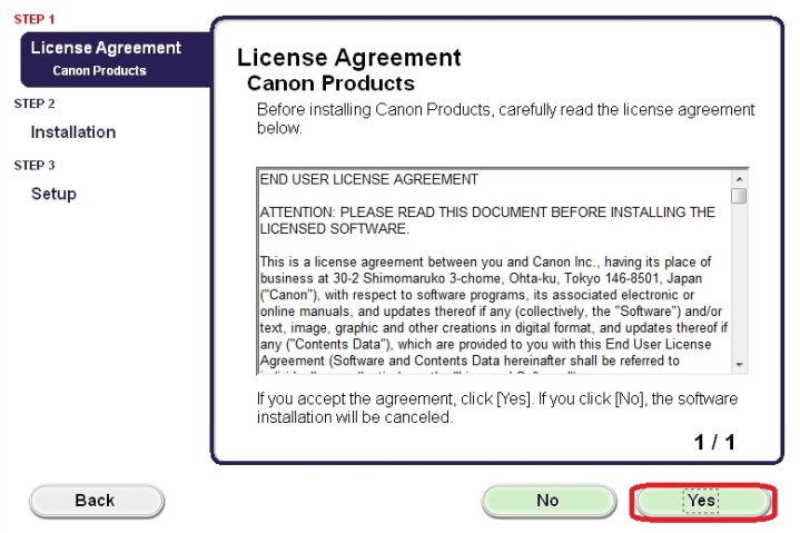 4. Ha megjelenik a következő képernyő, a végfelhasználói licencszerződés elfogadásához kattintson a [Yes/Igen] gombra.