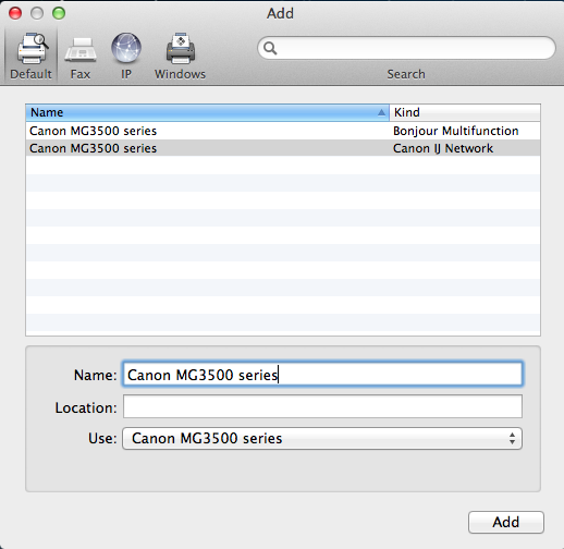 Ha megjelenik a következő képernyő, válassza ki a [Canon IJ Network] illesztőprogram-verziót, majd kattintson az [Add/Hozzáadás] gombra.