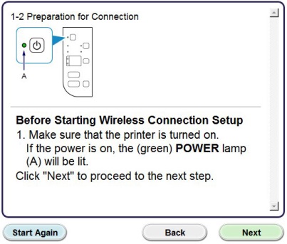 3. Győződjön meg arról, hogy a nyomtató be van kapcsolva, és hogy a tápellátás jelzőfény is világít, majd kattintson a [Next/Tovább] gombra.