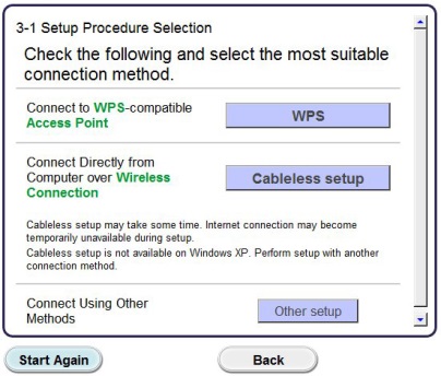 2. Ha megjelenik a következő képernyő, kattintson a [Cableless setup/Kábel nélküli beállítás] lehetőségre.