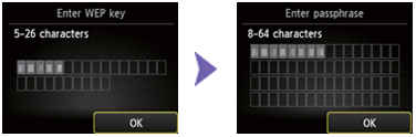 4. Az alábbiak közül az egyik képernyő megjelenik a nyomtatón, attól függően, hogy hozzáférési pontja melyik biztonsági módszert alkalmazza.