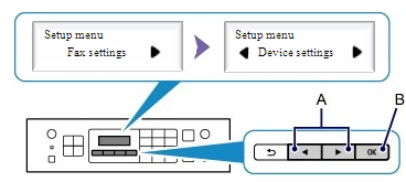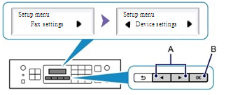 1. A nyílgombok segítségével (A) válassza ki a [Device settings/Készülék beállításai] menüpontot, majd nyomja meg az [OK] gombot (B).