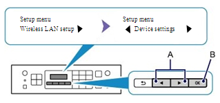 A nyílgombok segítségével (A) válassza ki a [Device settings/Készülék beállításai] menüpontot, majd nyomja meg az [OK] gombot (B).