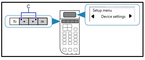 - A nyílgombok segítségével (C) válassza ki a [Device settings/Készülék beállításai] menüpontot, majd nyomja meg az [OK] gombot.