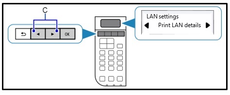- A nyílgomb segítségével (C) válassza ki a [Print LAN details/LAN-adatok nyomtatása] menüpontot, majd nyomja meg az [OK] gombot.