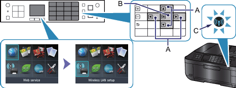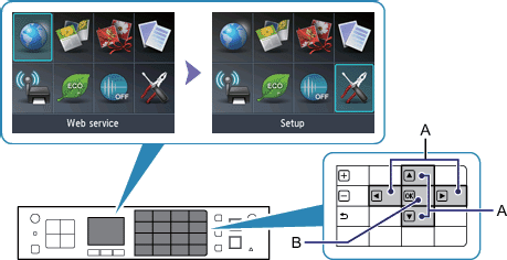 ] gombokkal navigáljon a [Wireless LAN Setup/Vezeték nélküli LAN beállítása] vagy a [WLAN Setup/WLAN beállítása] ikonhoz, és nyomja meg az [OK] gombot (B).