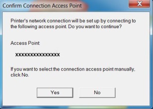 2. Ha a számítógép érzékeli a nyomtatót, a következő képernyő jelenik meg. Megjelenik annak a hozzáférési pontnak a neve, amelyikhez a számítógép csatlakozik (ahol a „xxxxxxxxxxxxx” jelölés látható). Ha ez az a vezeték nélküli hálózat, amelyikhez nyomtatóját csatlakoztatni szeretné, kattintson a [Yes/Igen] gombra.